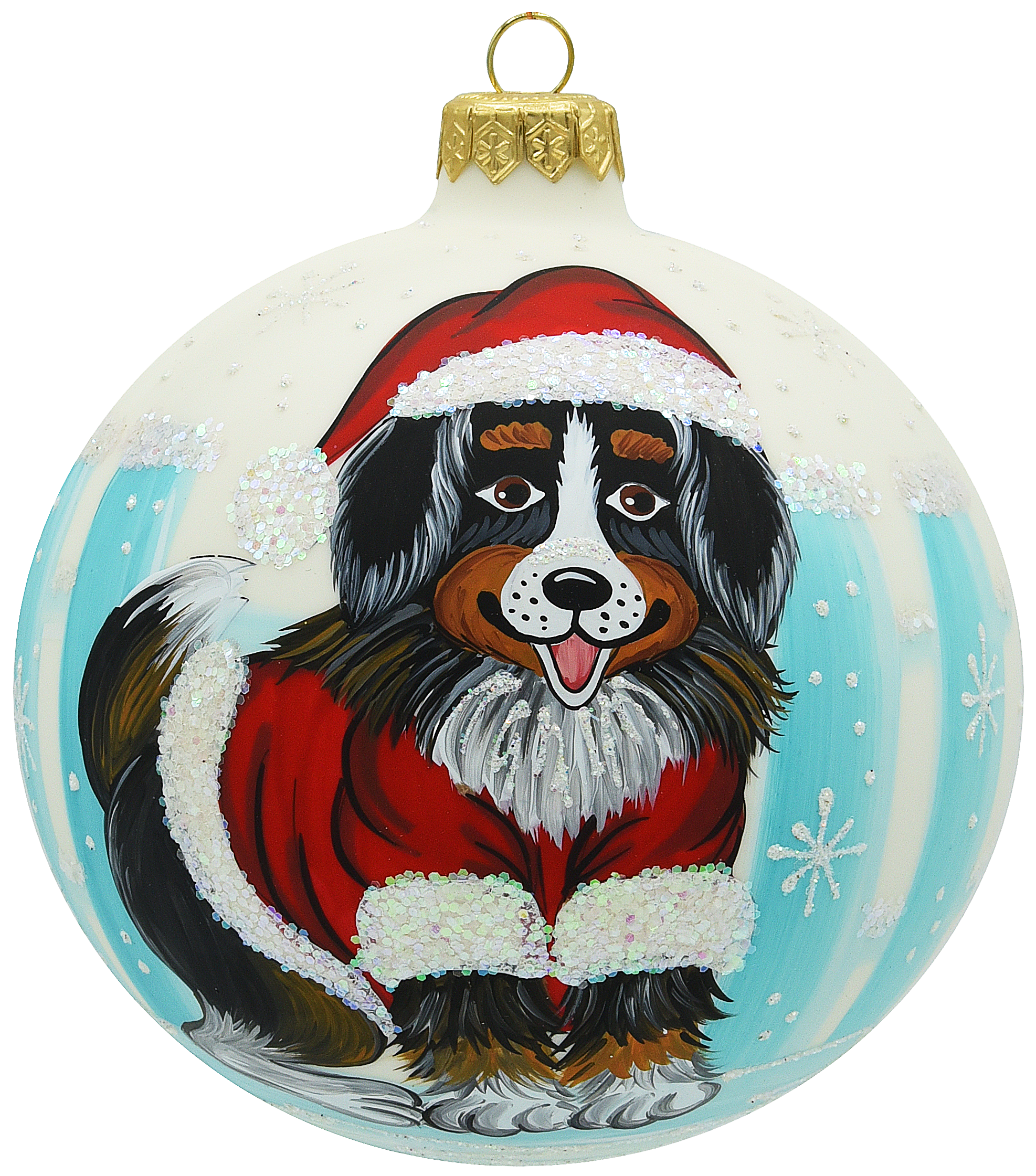 Bombka ma średnicę 12 cm, jest biała z dekoracją pieska z czapką mikołaja, który wprowadza radosny, świąteczny klimat.
