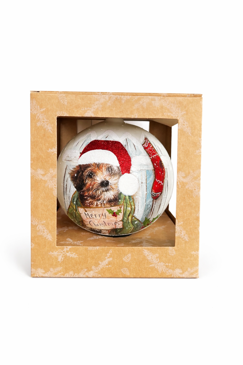 Bombka ma średnicę 15 cm, jest biała z dekoracją psa w mikołajkowym stroju, który wprowadza radosny, świąteczny klimat.