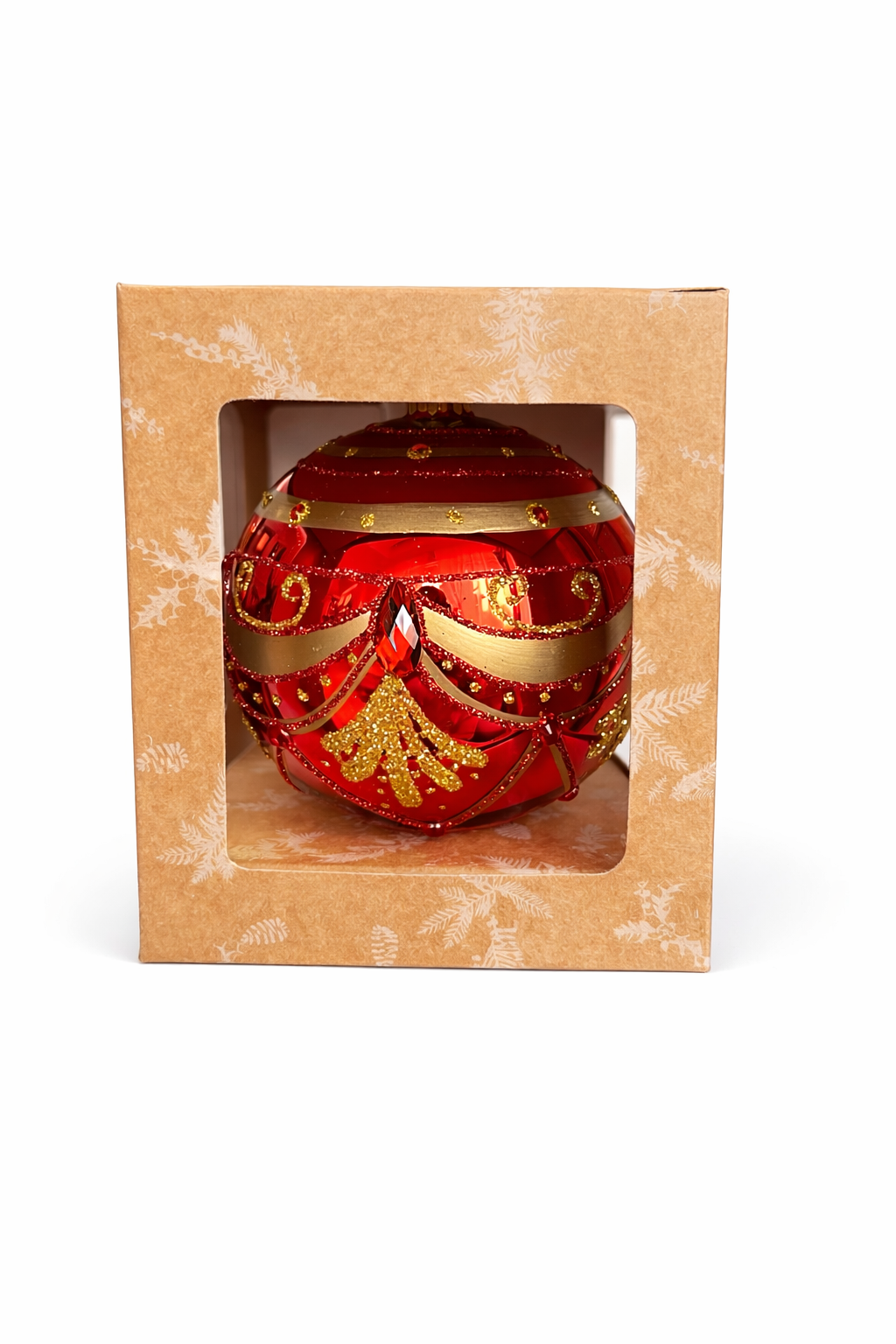 Bombka w czerwonym kolorze, który będzie idealnym dodatkiem do wielu świątecznych aranżacji lub idealnym upominkiem.