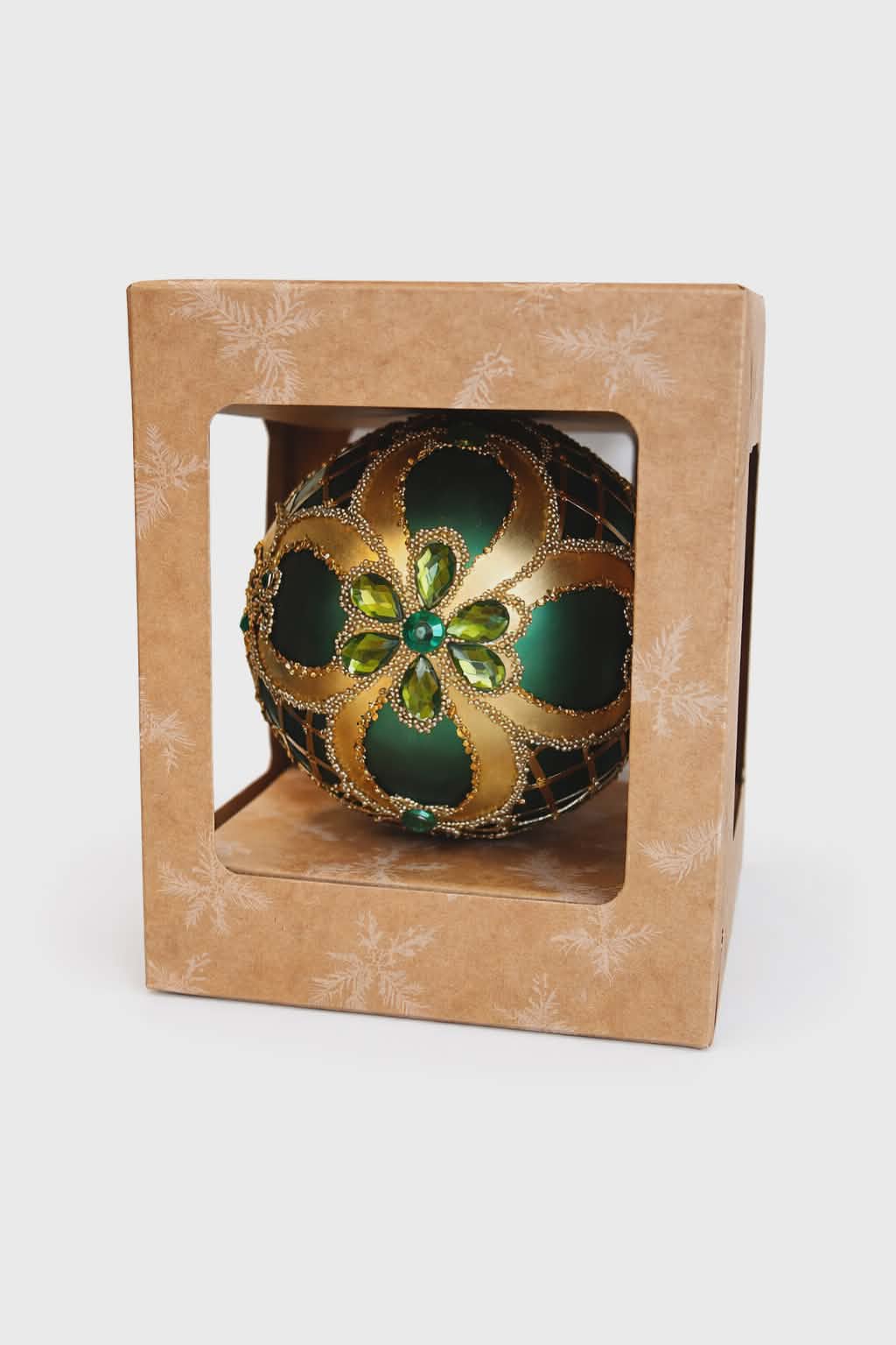 Bombka jest zapakowana w kraftowe pudełko.