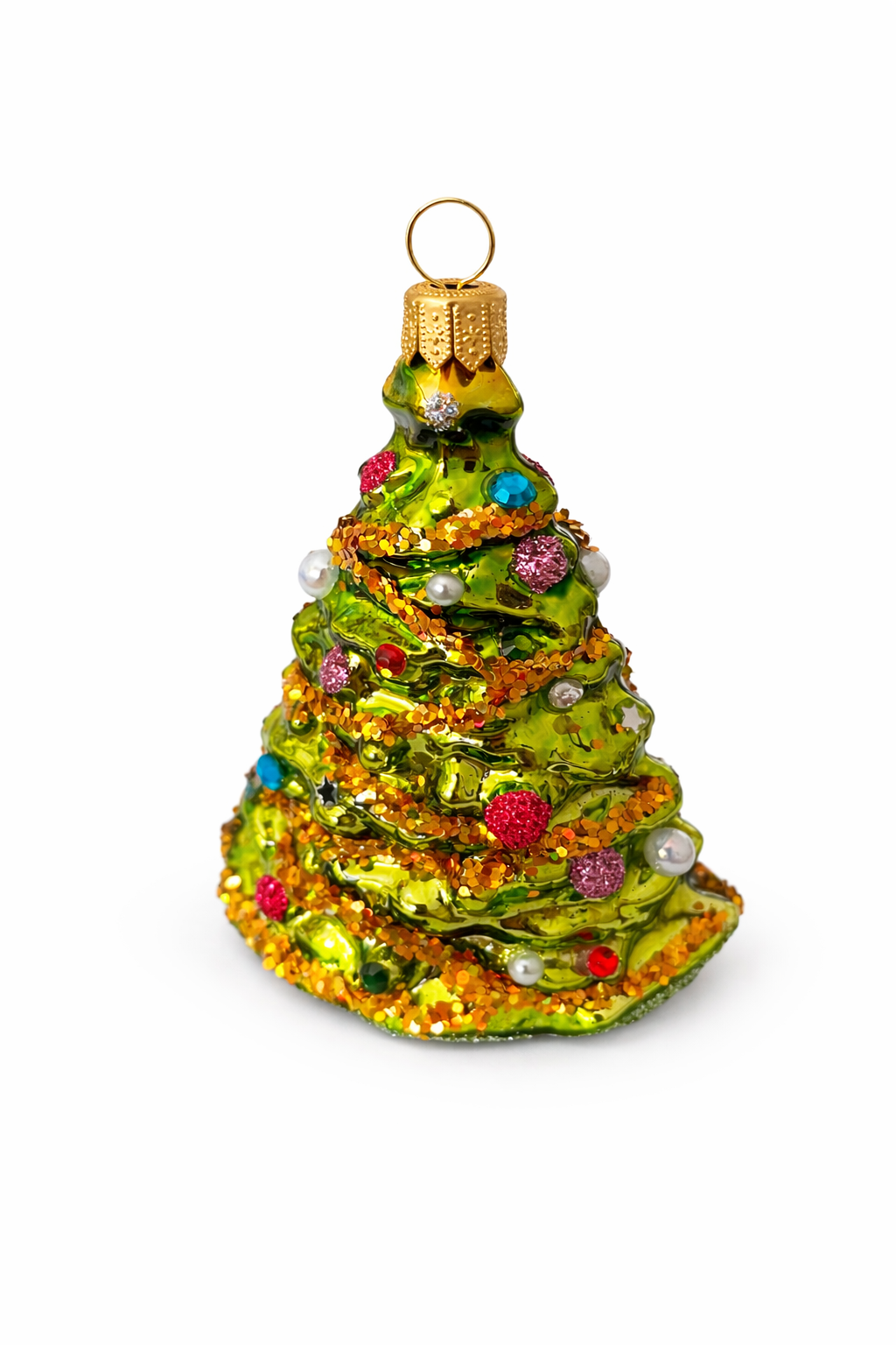 Zielona choinka z kolorowymi brokatowymi dodatkami wykonanymi ręcznie.
