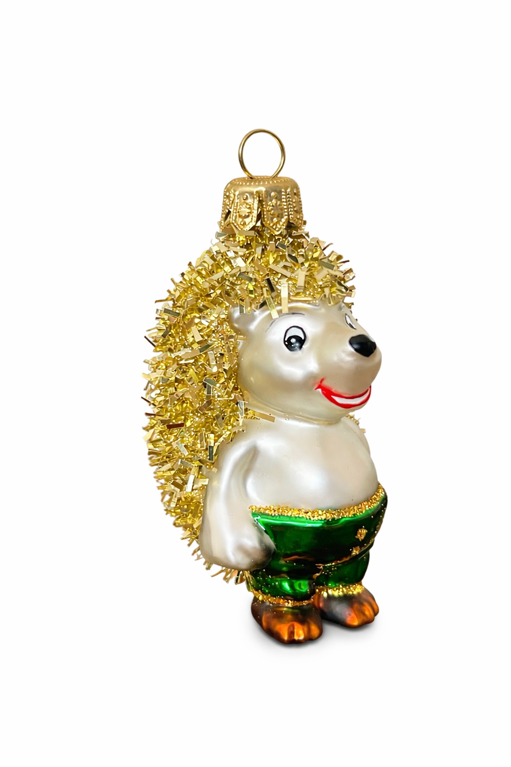 Biały jeżyk malowany ręcznie i zdobiony brokatami.