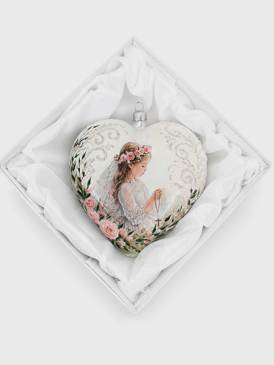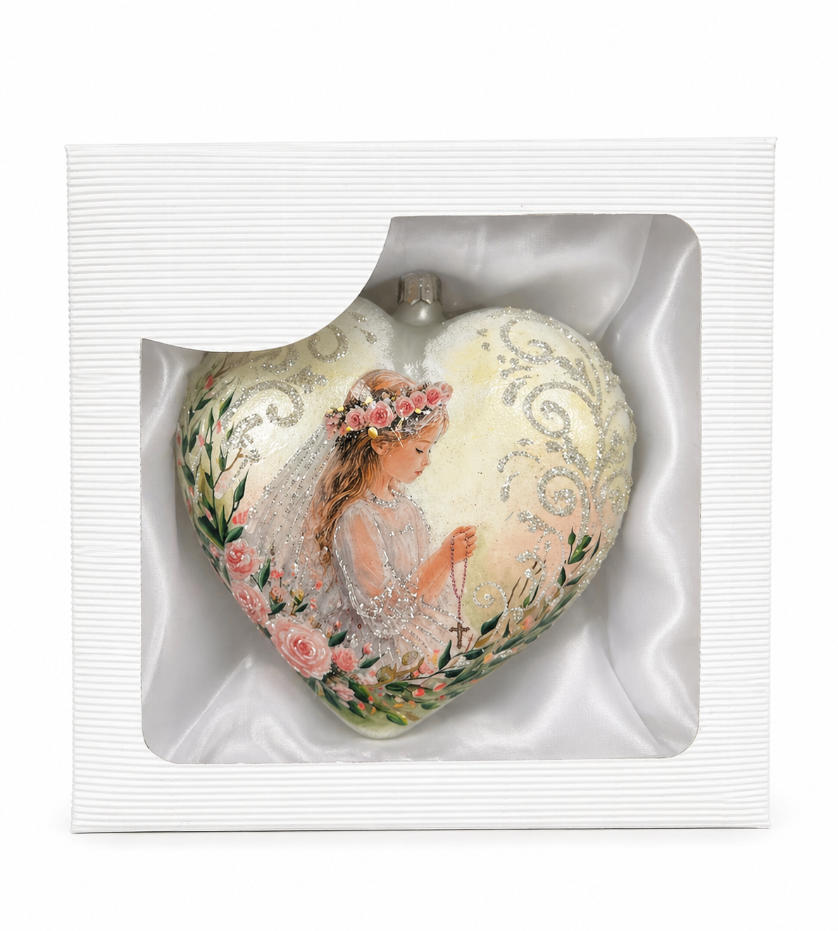 Elegancka biała bombka w kształcie serca stanowi wyjątkową pamiątkę Pierwszej Komunii Świętej.