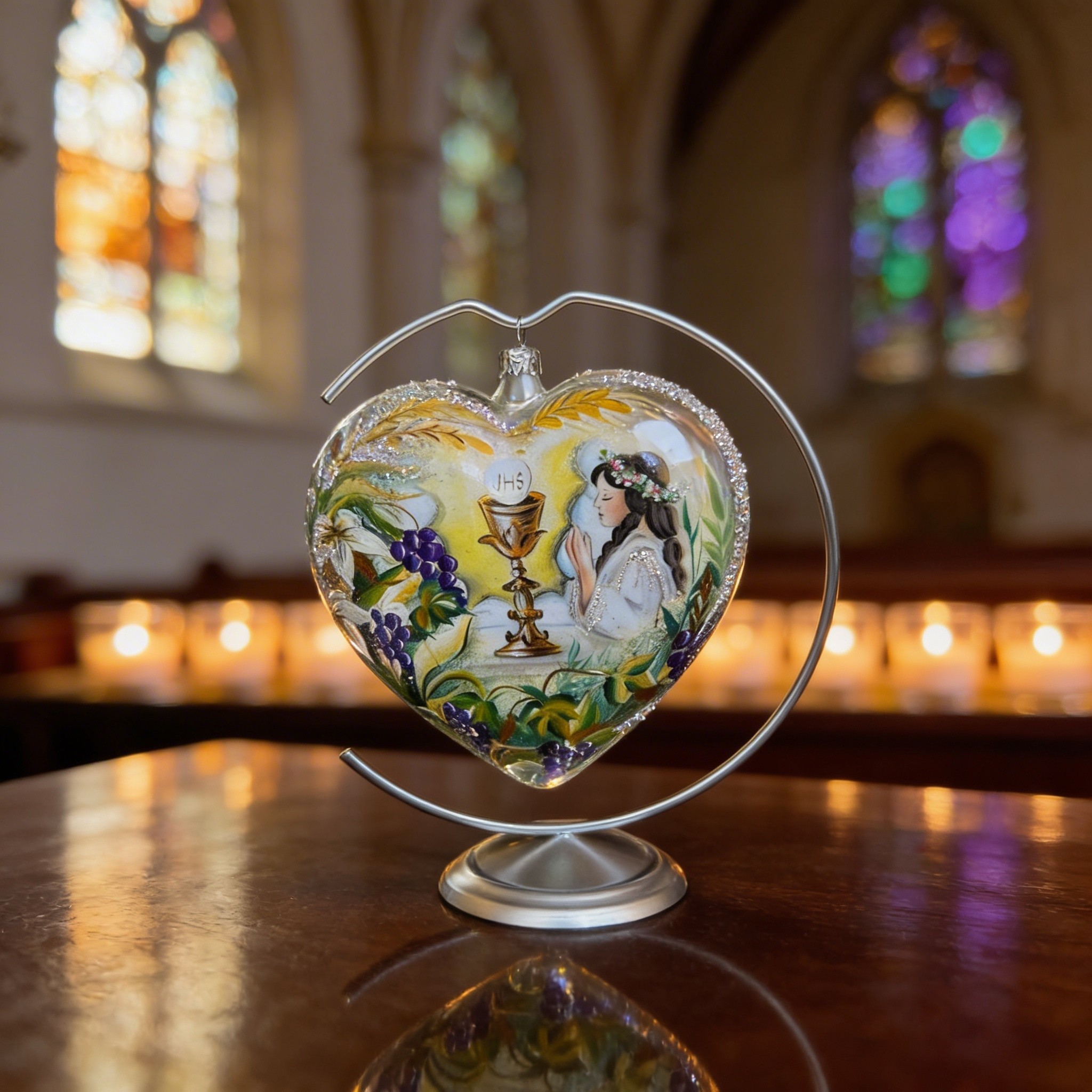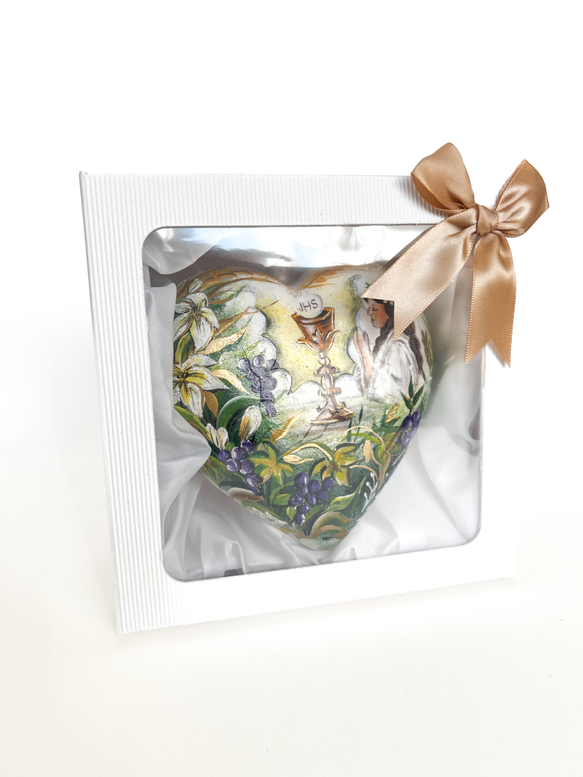 Elegancka biała bombka w kształcie serca stanowi wyjątkową pamiątkę Pierwszej Komunii Świętej.