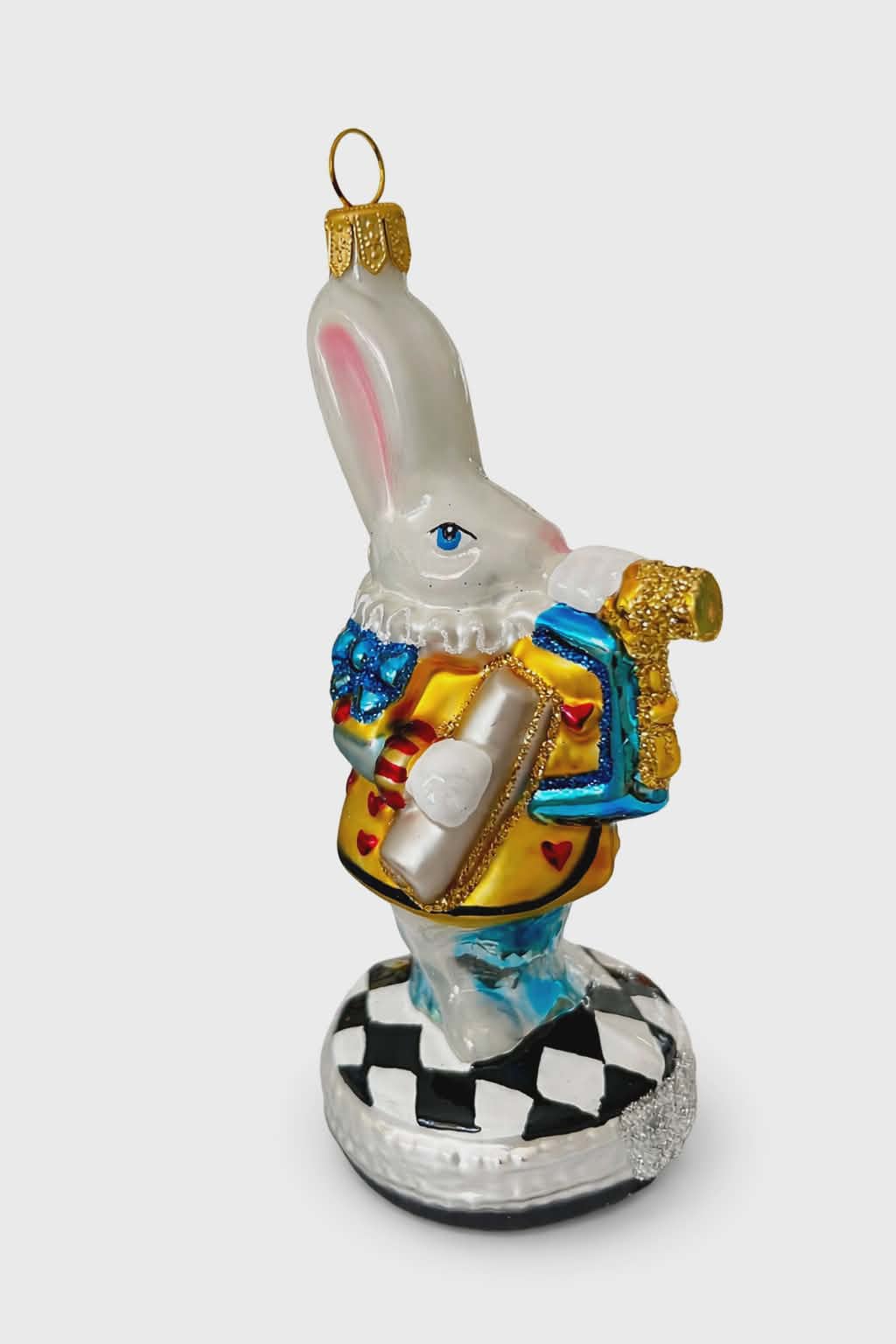 Szklana ozdoba w kształcie Króliczka z trąbką.
