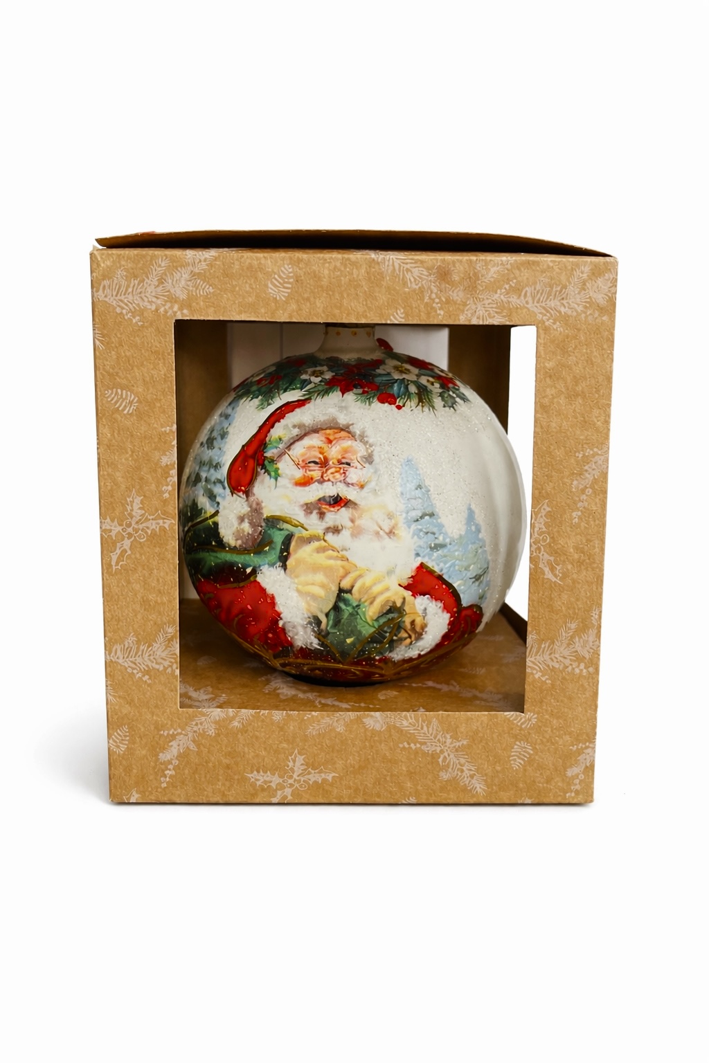 Szklana bombka choinkowa przedstawia klasyczną postać Świętego Mikołaja o życzliwym, uśmiechniętym obliczu z rumieńcami na policzkach i długą, białą brodą.