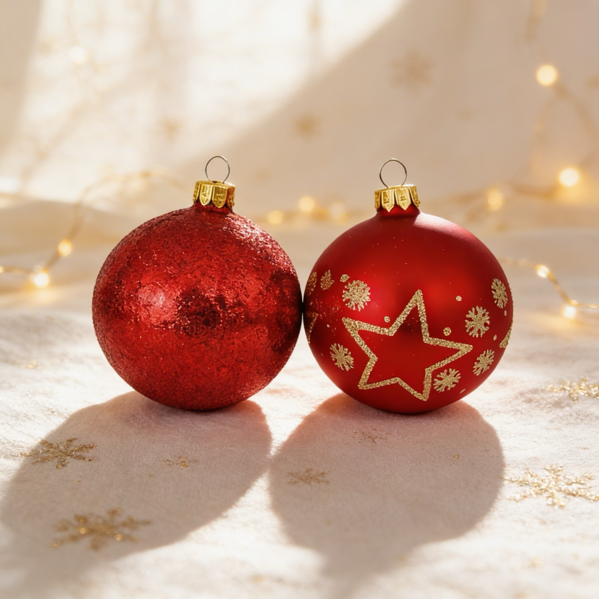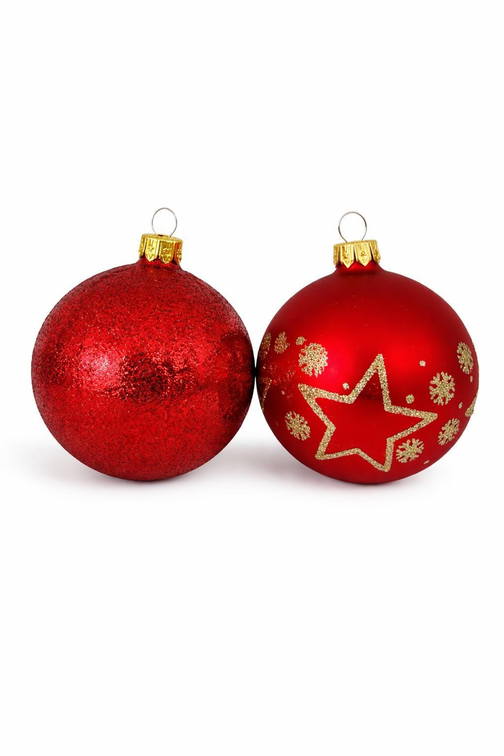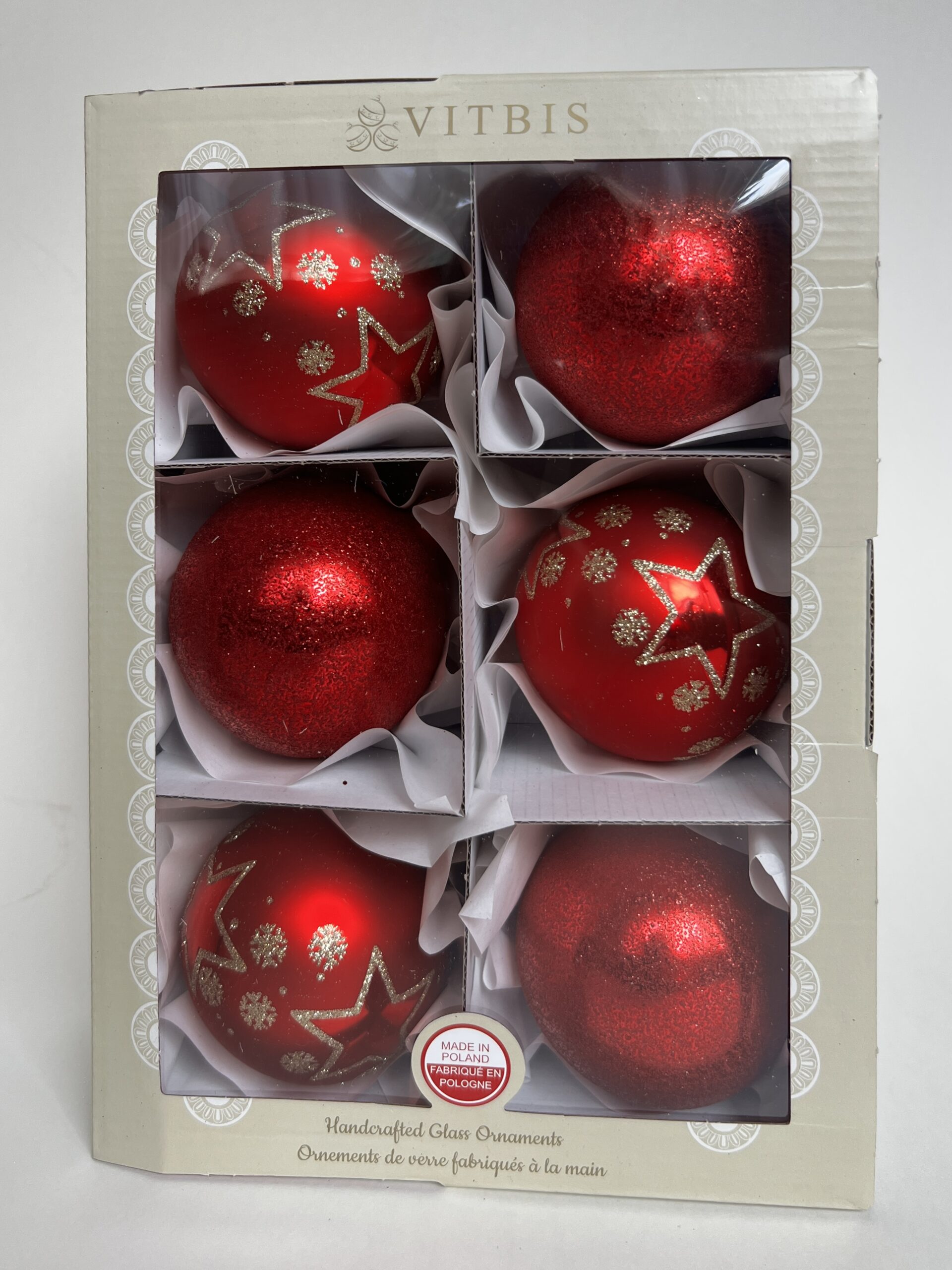 Zestaw składa się z 3 bombek czerwonych brokatowych oraz 3 bombek czerwonych matowych ze wzorem.