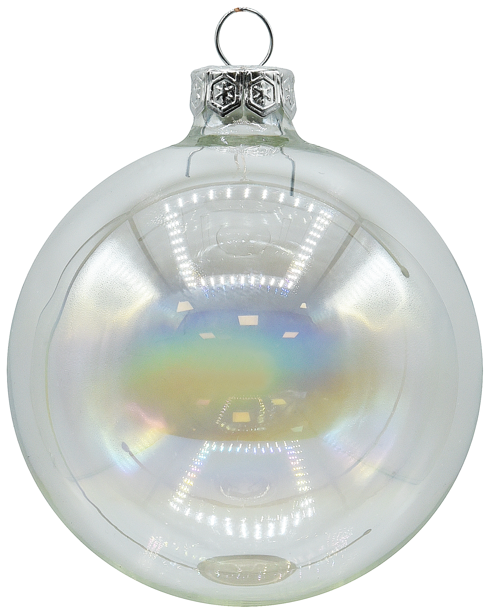 Szklana przezroczysta bombka choinkowa o białym wykończeniu.