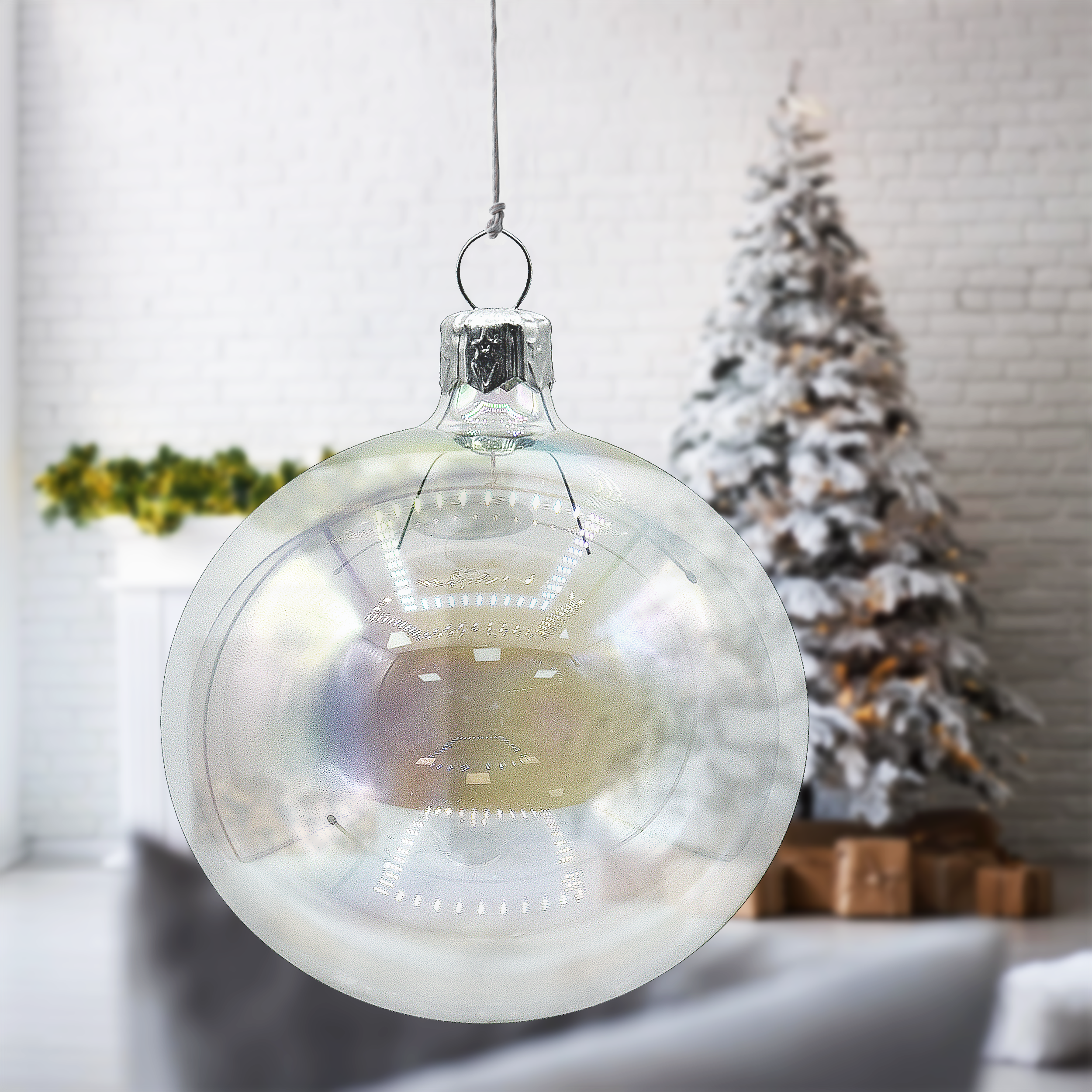 Bombka przezroczysta z białą dekoracją wykonaną drobinkami brokatu .