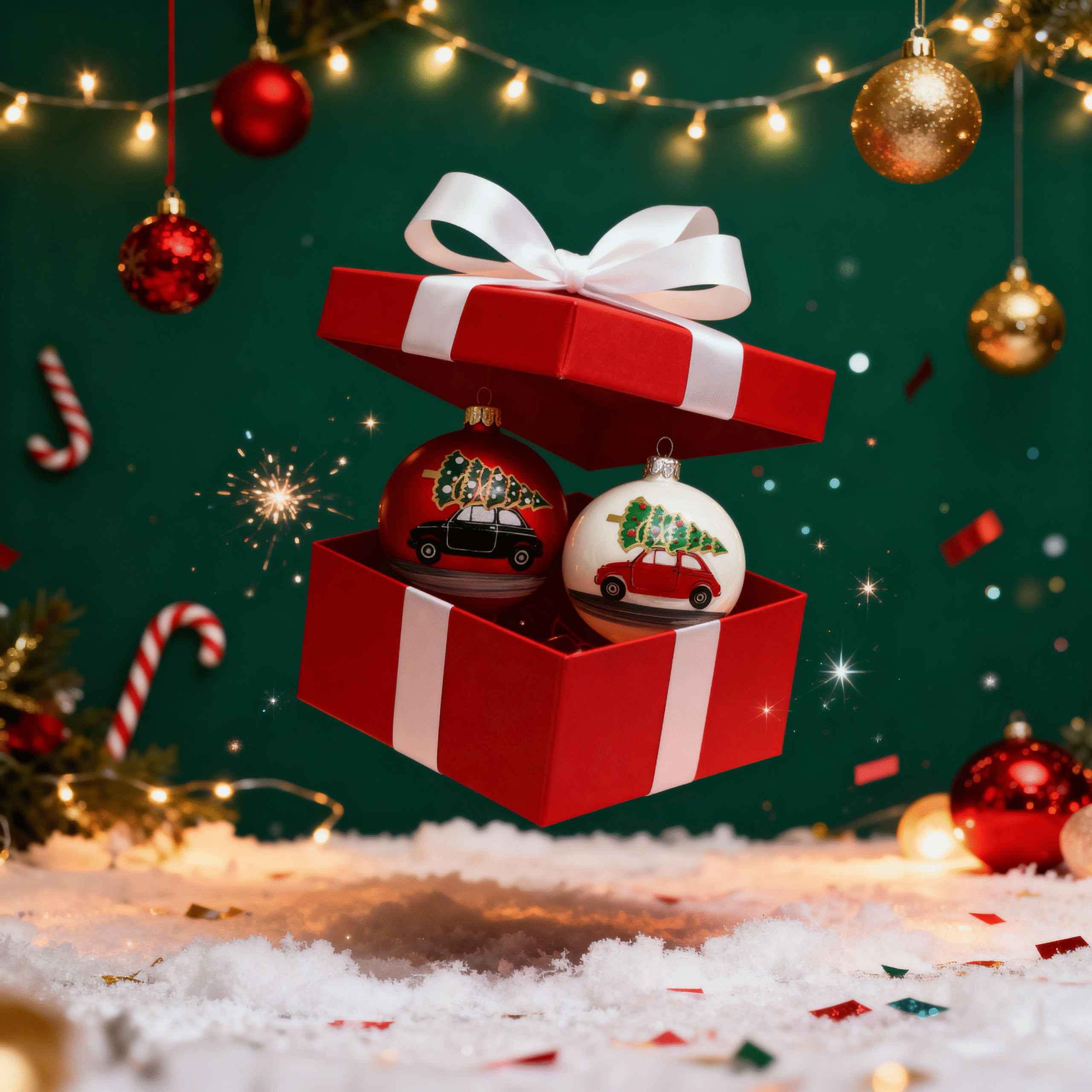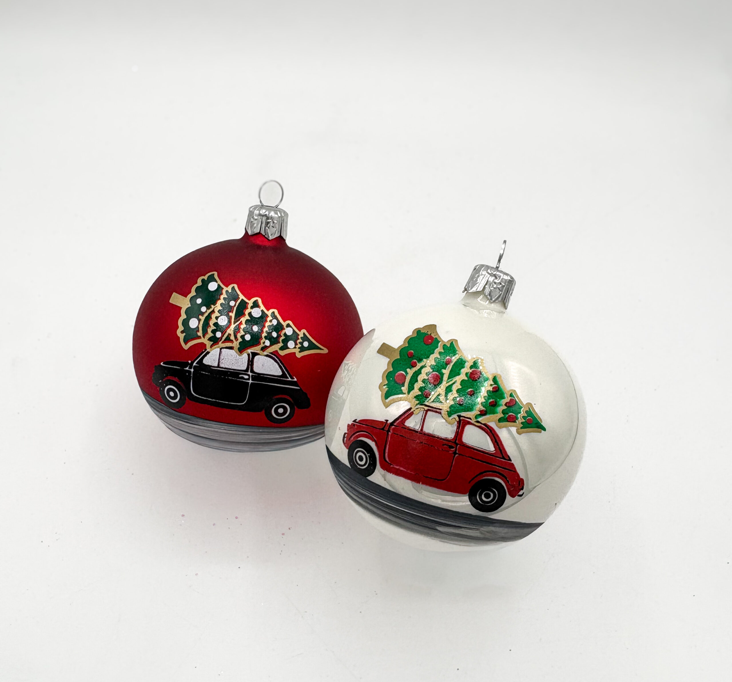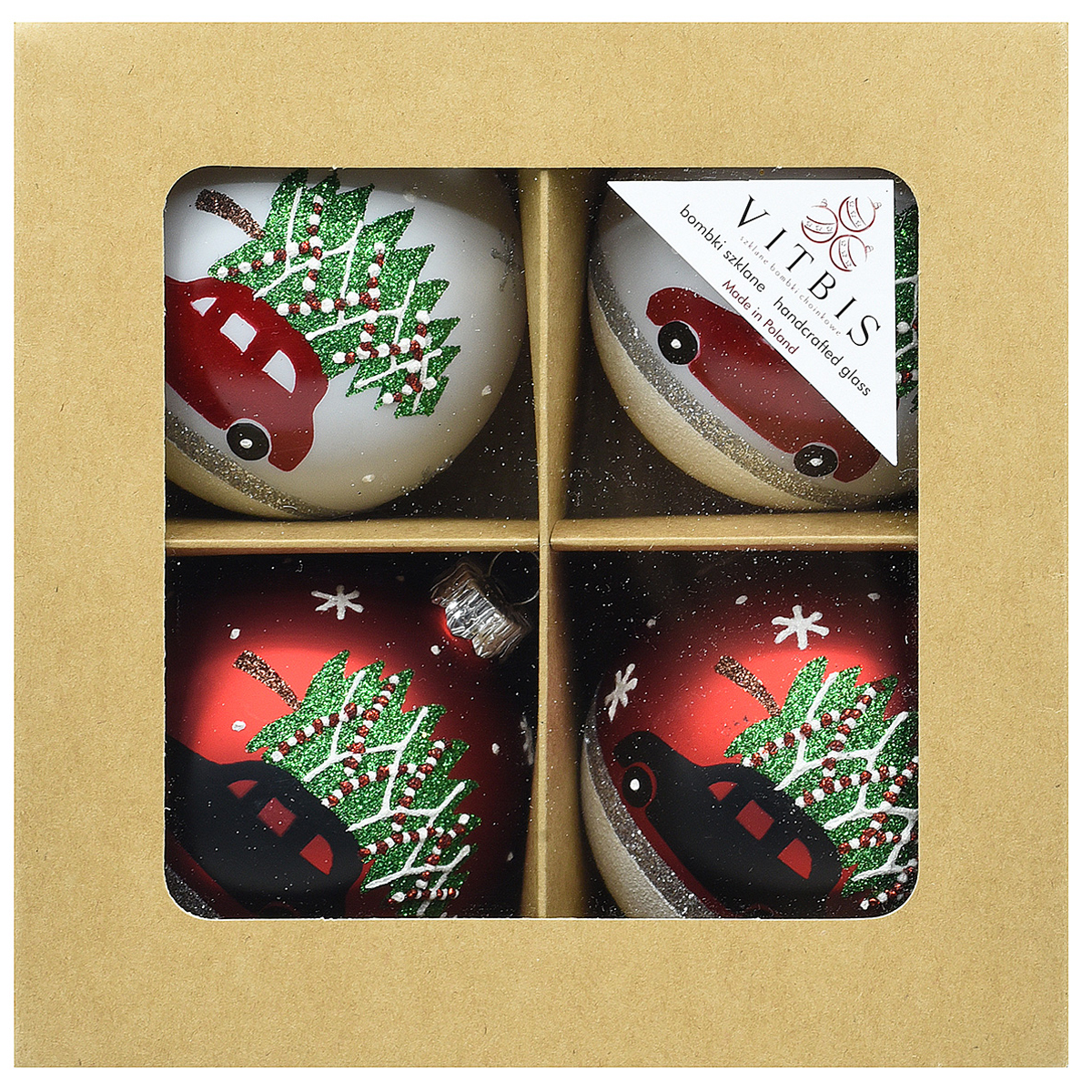 W skład zestawu wchodzi 4 bombki o średnicy 8 cm, wszystkie ozdobione uroczą dekoracją przedstawiającą świąteczne autko.