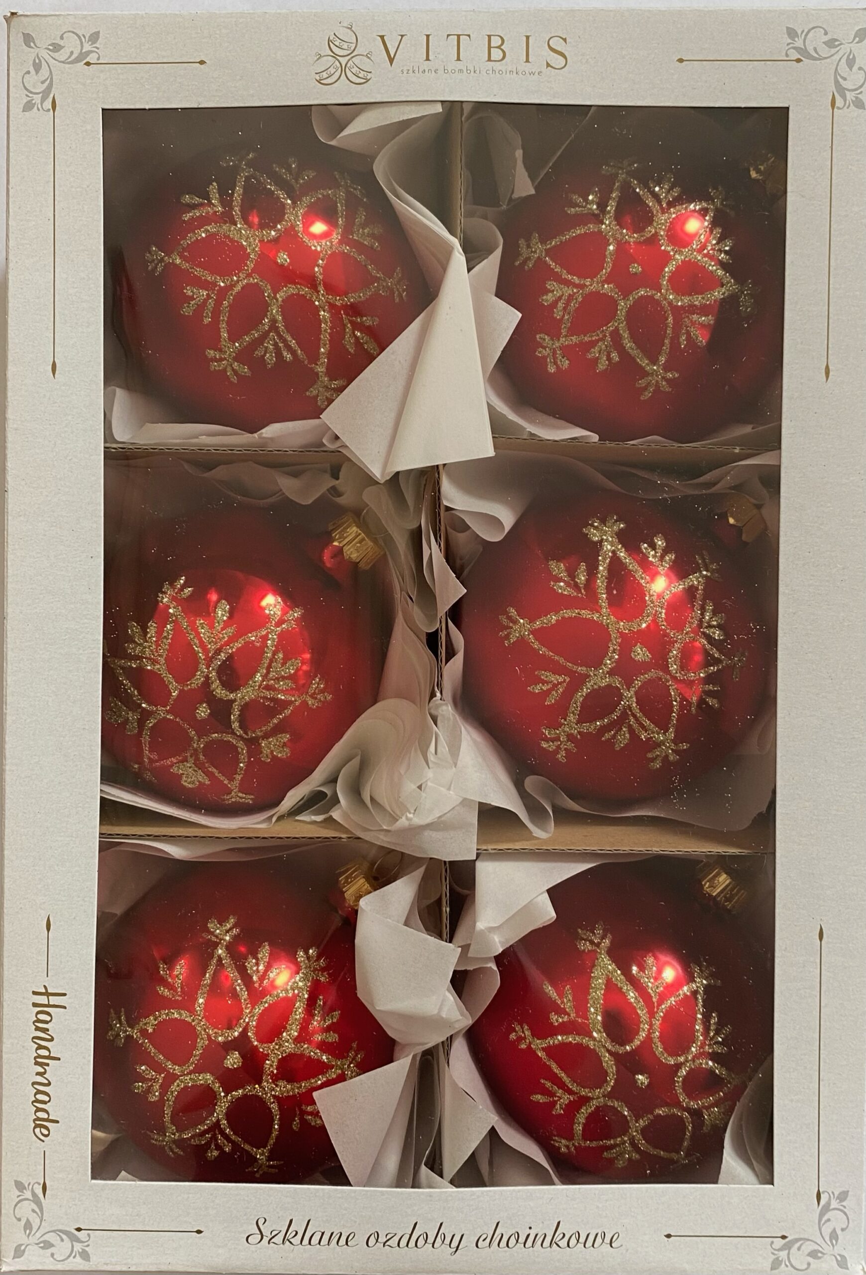 Zestaw składa się z 3 bombek białych matowych oraz 3 bombek czerwonych ze wzorem.