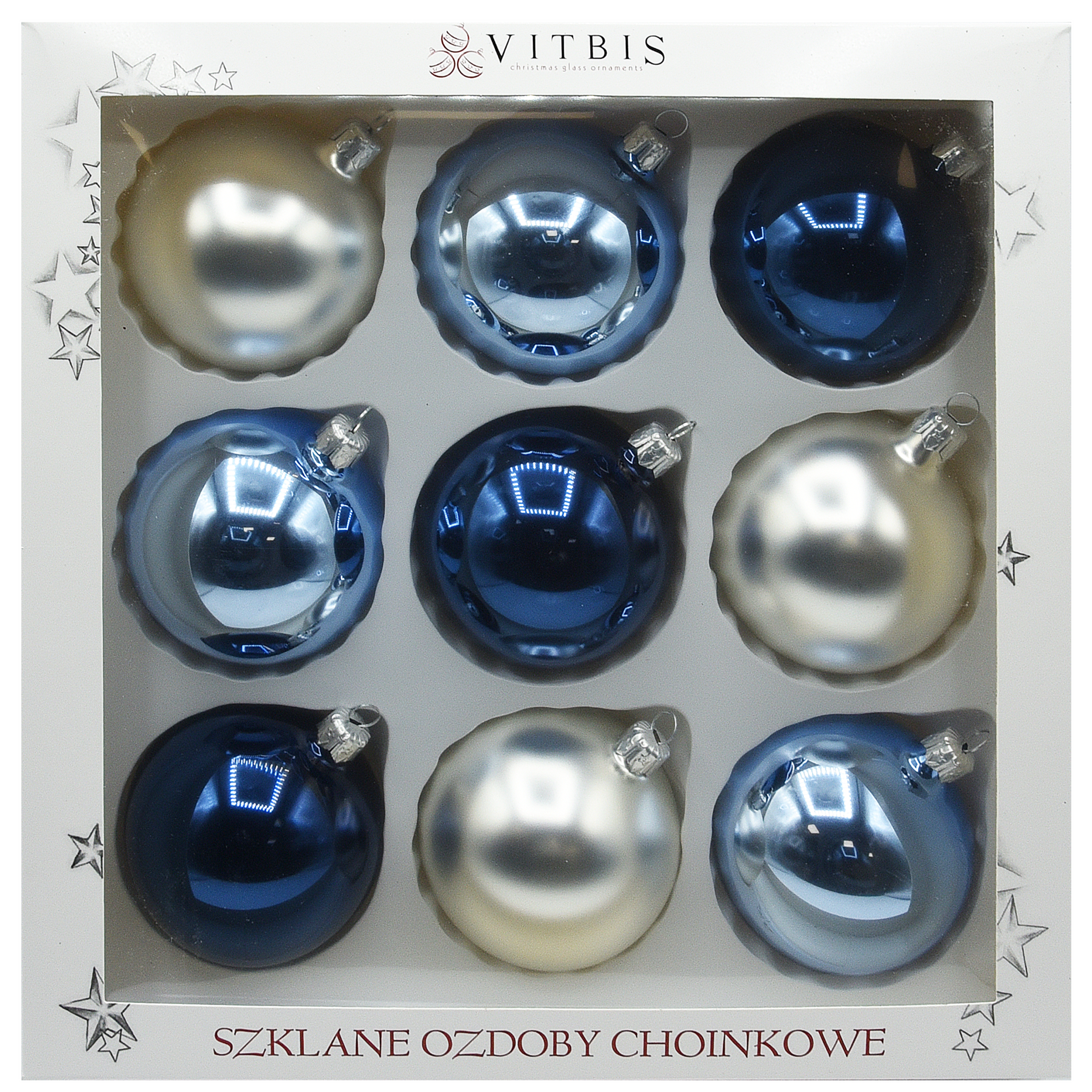 Zestaw składa się z 3 bombek srebrnych matowych , 3 granatowych błyszczących oraz 3 niebieskich błyszczących, a każda z nich ma średnicę 8cm i gładką powierzchnię.