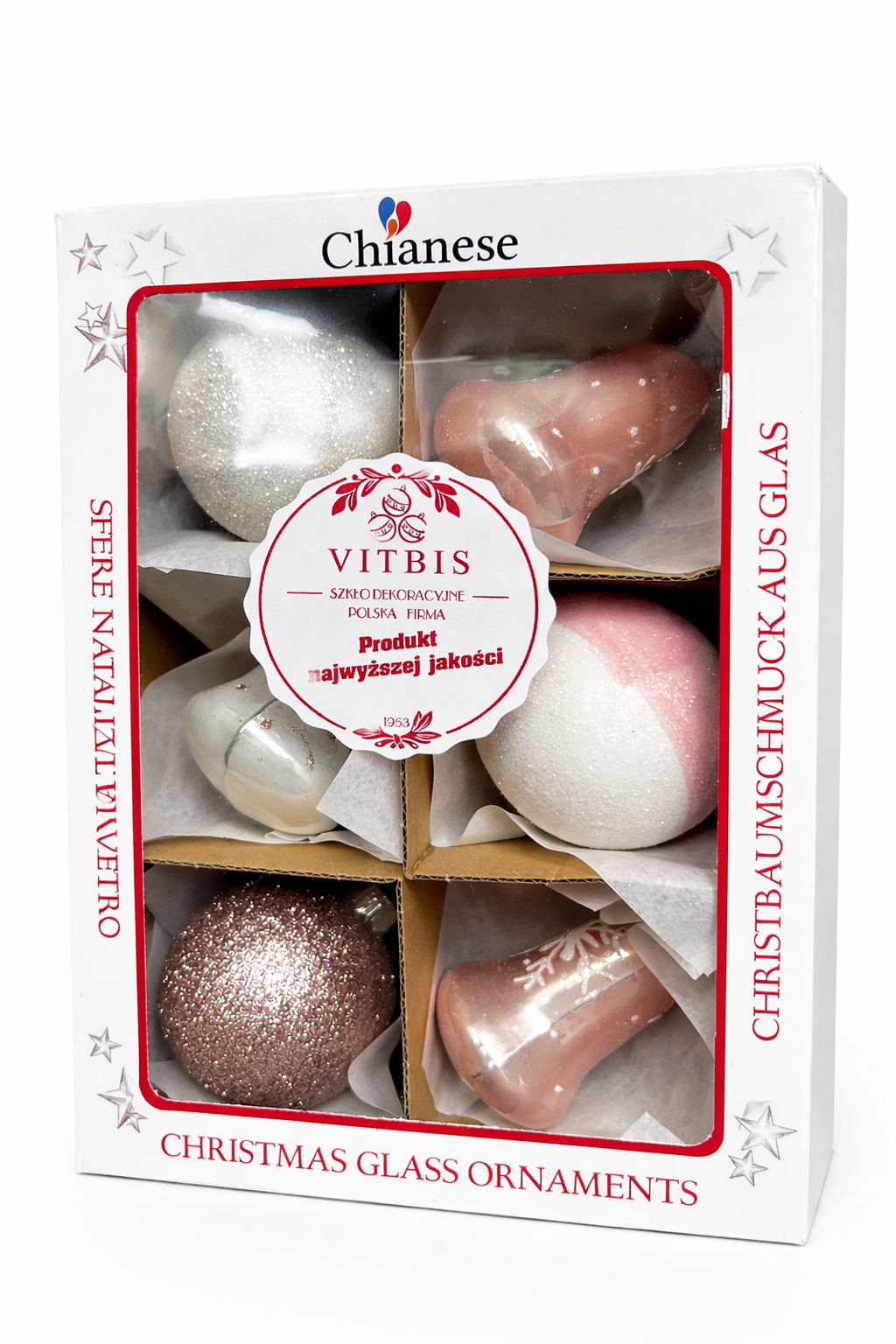 Zestaw 6 szklanych bombek świątecznych o wielkości 6cm to urocza propozycja, idealna do dekoracji małych choinek, stroików, girland oraz wszelkich drobnych aranżacji świątecznych.
