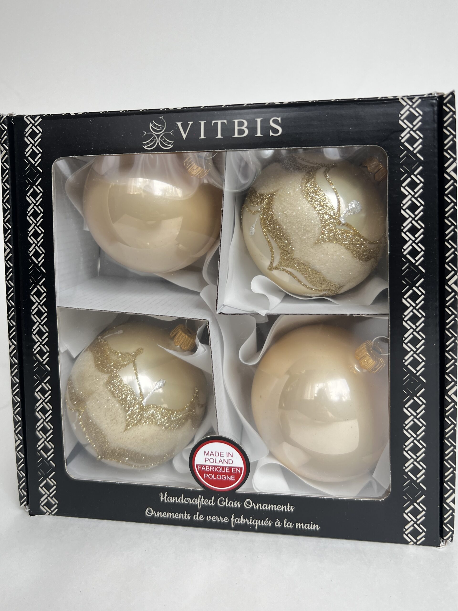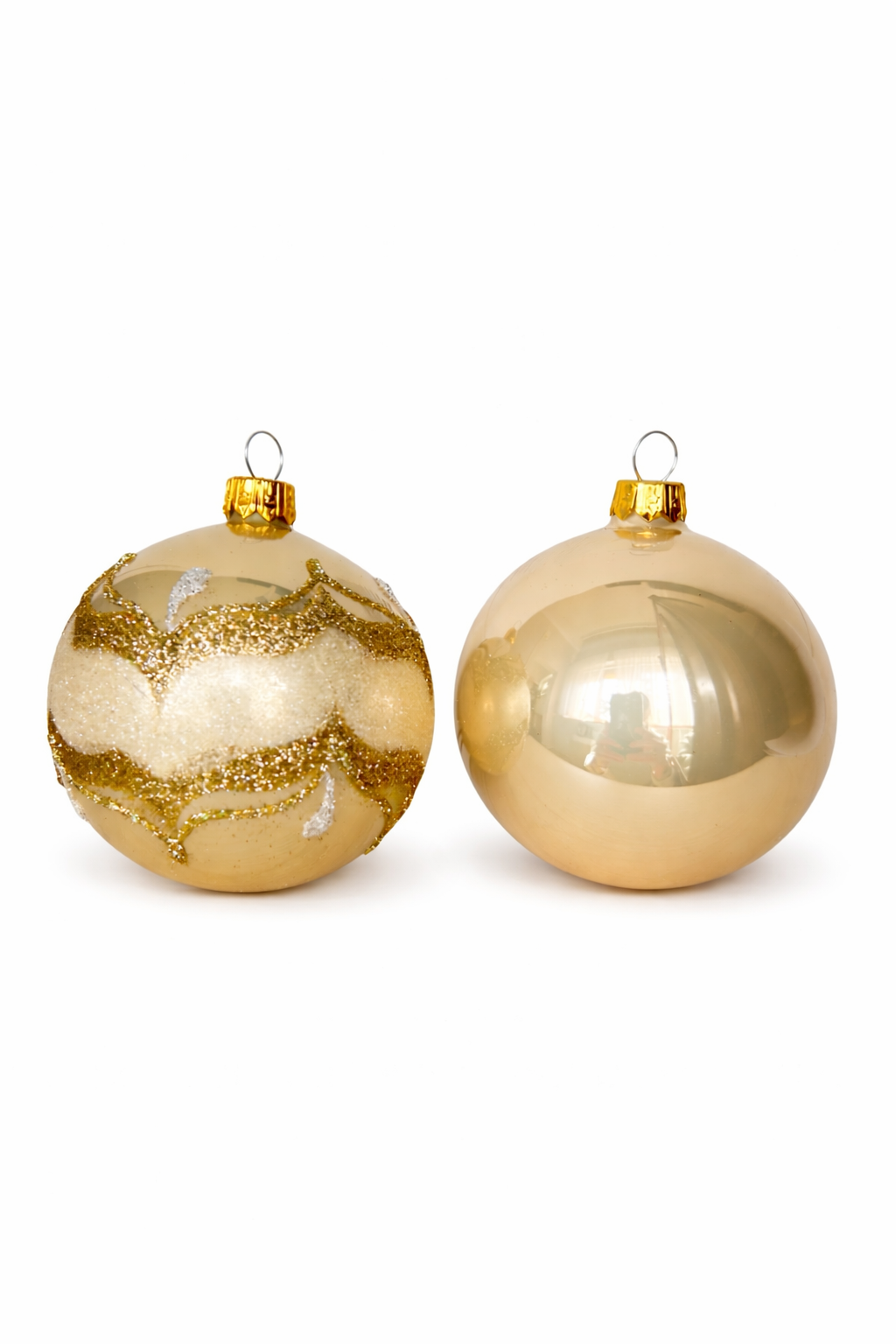 W komplecie znajdują się dwie gładkie, szampanowe bombki o błyszczącym wykończeniu oraz dwie bombki zdobione efektowną dekoracją.