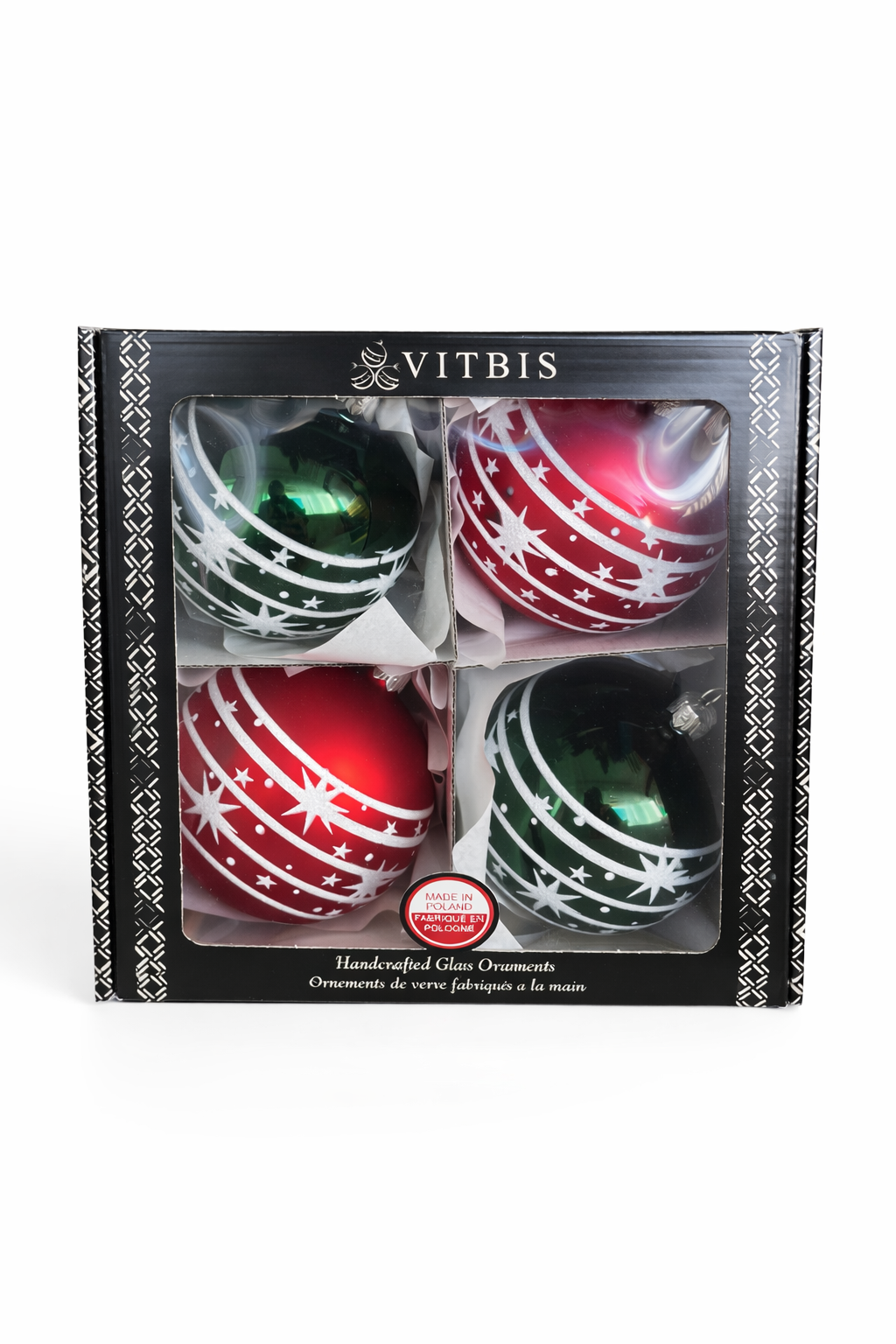 W skład zestawu wchodzą 4 bombki o średnicy 10 cm, z których każda została ręcznie ozdobiona.
